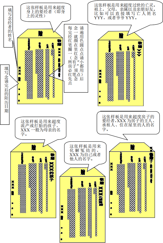 ④超度流产或打胎的孩子,每个需要 7-21 张,敬赠母亲名字的孩子(如果孩子是来讨债的,则可能需要更多经文组合才能超度走)。